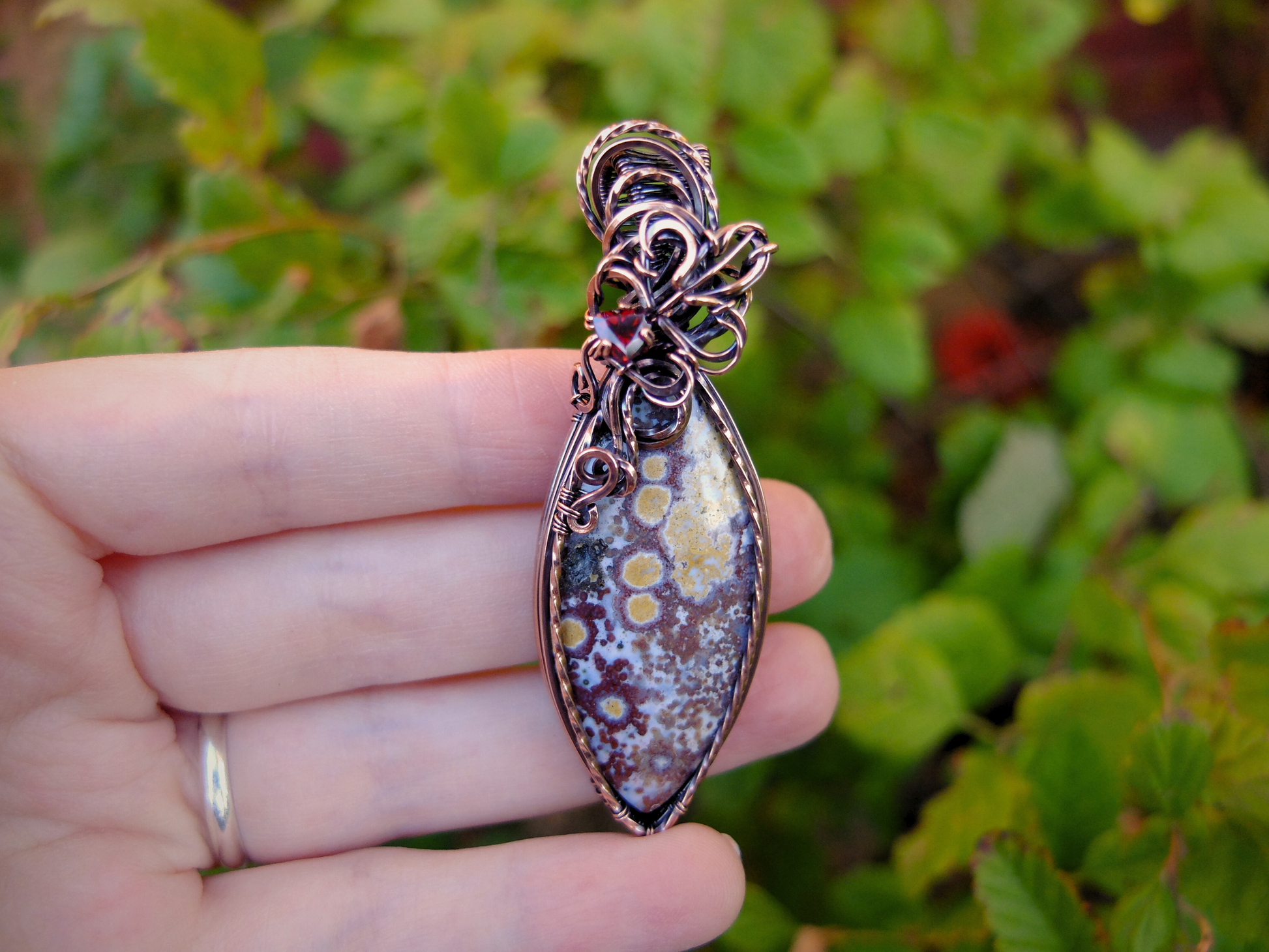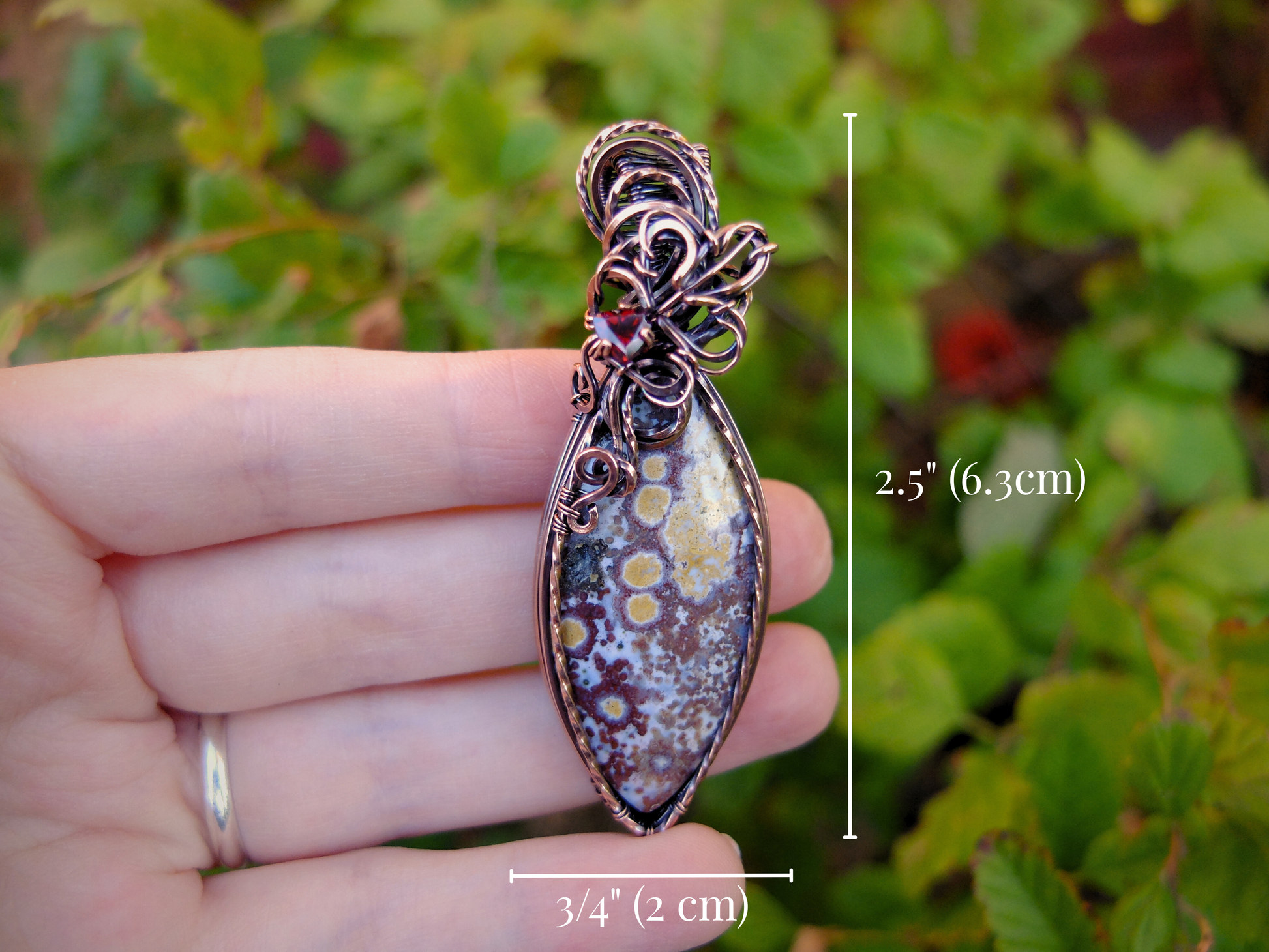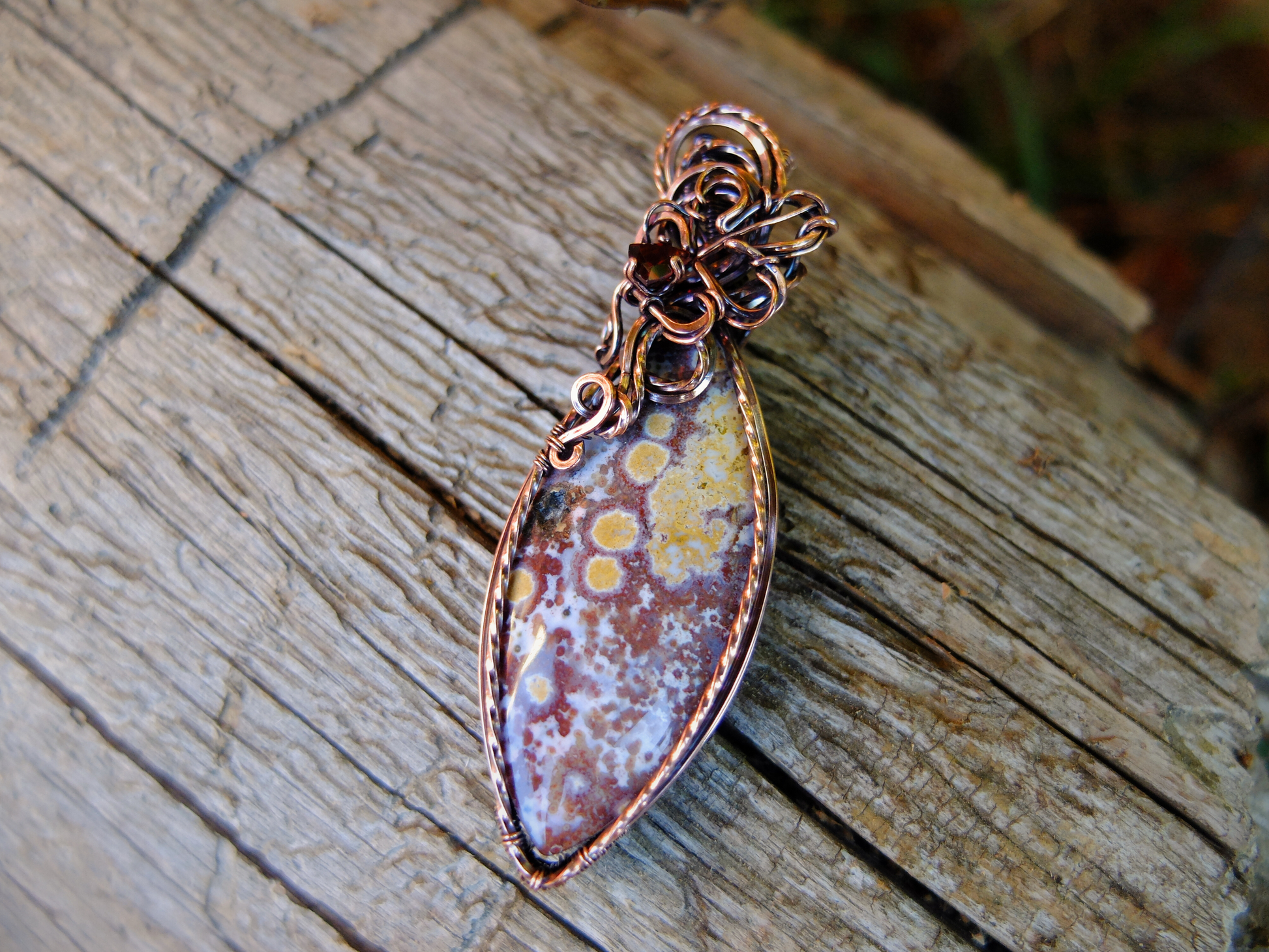 At the center rests a polished River Jasper, its natural patterns reminiscent of rippling water and fallen leaves caught in the current. Above it, a hand-formed copper oak leaf gracefully cradles a deep faceted garnet, adding a spark of warmth and light, like the last embers of a campfire glowing at dusk. The design blends rustic charm with refined artistry, every curve and coil shaped by hand to create a piece that feels alive with movement and meaning.