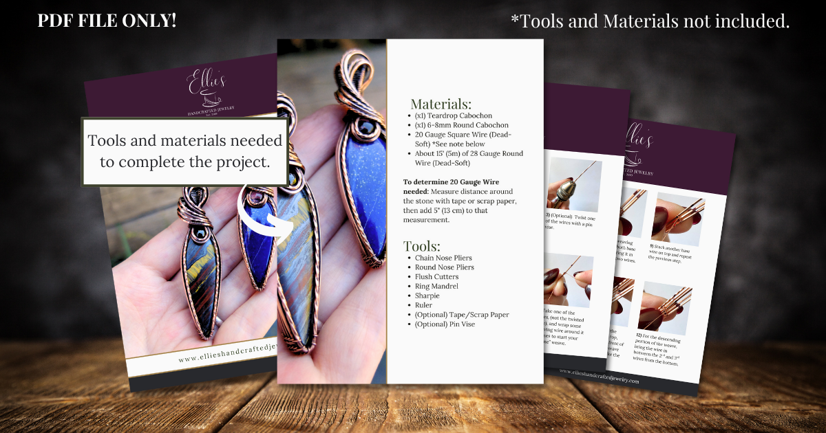 Inside this comprehensive PDF guide, you’ll find step-by-step instructions with clear photos that walk you through creating the "Rosalie" pendant from start to finish. From building the structural frame to weaving detailed patterns and setting both a teardrop cabochon and accent stone, every stage is explained with care so you can feel confident in your process.